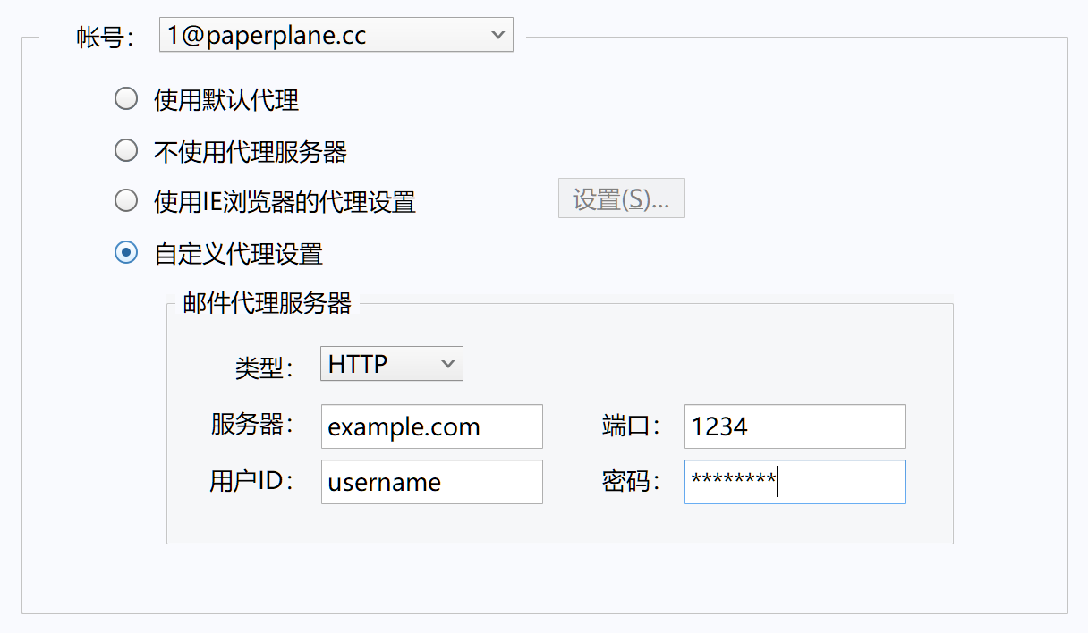 使用 HTTP 代理时,需要填写代理服务器地址和端口,以及用户名和密码。
